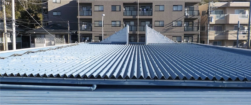 漏水中の折板屋根です。外観では漏水箇所は全く分かりません。 |