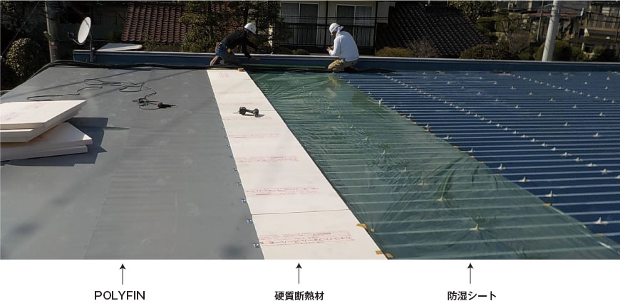 折板屋根の上に硬質の断熱材(PS断熱材3種B)を敷き表面を平らにしてからポリフィンを折板に |